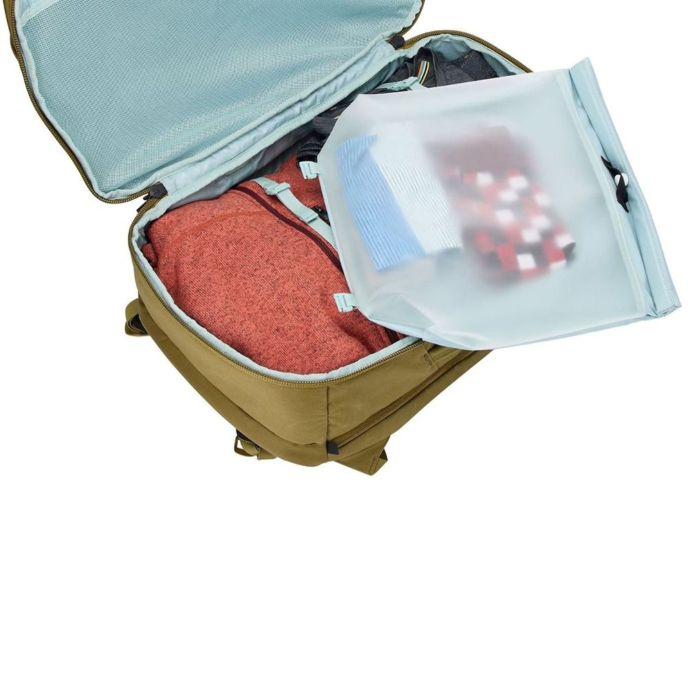 Include un cub de compresie detasabil cu o captuseala TPU care separa mirosul, umezeala si murdaria de restul gentii si functioneaza ca o geanta de zi.